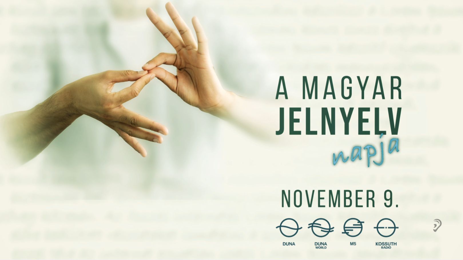 A magyar jelnyelv napját 2017 óta ünnepeljük november 9-én, a magyar jelnyelvről és a magyar jelnyelv használatáról szóló 1991-ben elfogadott törvény tiszteletére. A SINOSZ (Siketek és Nagyothallók Országos Szövetsége) kezdeményezésére ez a nap a jelnyelv fontosságára és szerepére hívja fel a figyelmet. Jeltolmács közreműködésével több közszolgálati csatorna műsora is elérhető a hallássérült nézők számára, ezzel is elősegítve az esélyegyenlőséget és a nyelvi hozzáférést. A közmédia gyerekcsatornája, az M2, heti rendszerességgel jelentkezik a jelnyelv elsajátítását támogató Jelnyelvi percek magazinműsorral, saját gyártású hétköznap esti Hetedhét kaland című műsorukat pedig mindig jelnyelvi tolmács kíséri. A Kossuth Rádió Vendég a háznál című minden hétköznap 11:30-tól jelentkező műsora is új formát kapott: 2024 tavaszán, havonta egy adás jelnyelvi tolmácsolással is elérhető az MTVA YouTube-csatornáján. Azóta, 2025 októberéig összesen húsz jelelt epizód készült el, köztük olyan témákkal, mint az autizmus és továbbtanulás, az örökbefogadás, a bántalmazás, vagy épp a hallássérültek közössége. A rövidített változatokat a Kossuth Rádió Facebook-oldalán is közzéteszik.